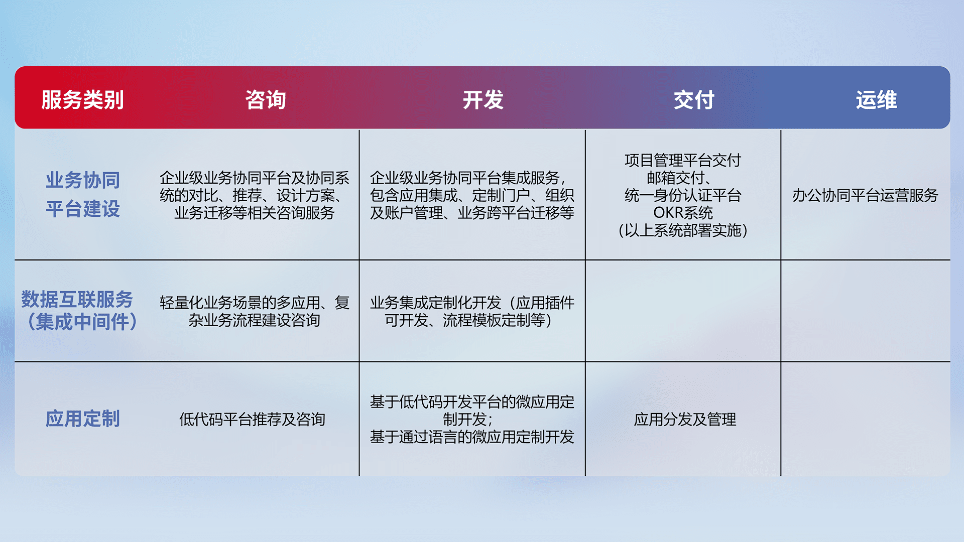 针对钉钉、、企微、、、、IDaas等平台级产品提供产品的规划、、、方案、、、、交付、、、、定制化开发等服务,,,实现如统一协同办公、、、智能客户服务、、、混合会议管理、、、智能数据查询、、等业务场景,,实现数字化转型。。。