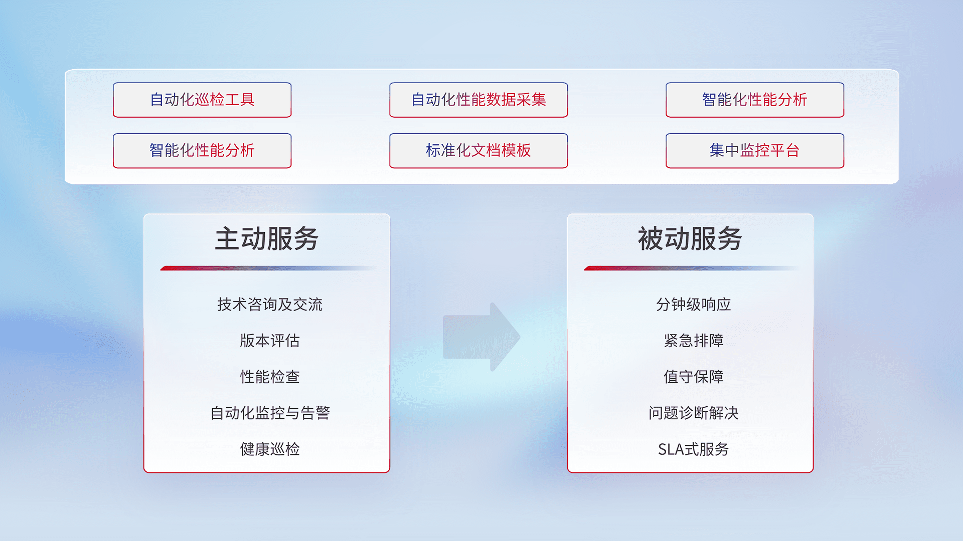 智能化工具和标准化文档,,,保障服务质量,,,,提供主动服务(包含技术咨询、、、、版本评估、、、性能检查、、、、自动化监控与告警、、、、健康巡检)和被动服务包含(分钟级响应、、紧急排障、、、值守保障、、、、问题诊断解决、、、SLA服务)。。